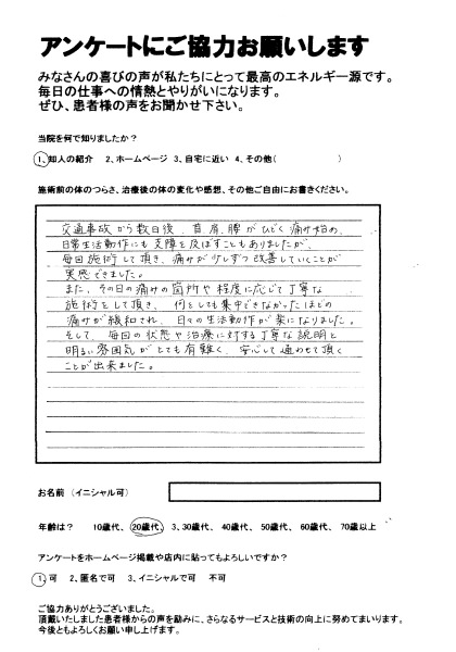 患者様の声 交通事故で身体に酷い痛みが…。日々の治療で集中できないほどの痛みが緩和! 2021.08.25 茂原市 Iさん(20代・女性) 交通事故から数日後、首・肩・腰がひどく痛みはじめ、日常生活の動作にも支障を及ぼすこともありましたが、毎回施術して頂き、痛みが少しずつ改善していくことが実感できました。 また、その日の痛みの箇所や程度に応じて丁寧な施術をして頂き、何をしても集中できなかったほどの痛みが緩和され、日々の生活動作が楽になりました。 そして、毎回の状態や治療に対する丁寧な説明と明るい雰囲気がとてもありがたく、安心して通わせていただくことができました。 Tweet Share Hatena Pocket RSS feedly Pin it この記事のタイトルとURLをコピーする 出産後の骨盤矯正。飛び跳ねたいほど痛みが取れました! 前の記事 趣味の自転車でひどい痛みが…。今では大会で結果を残せるほど回復しました! 次の記事