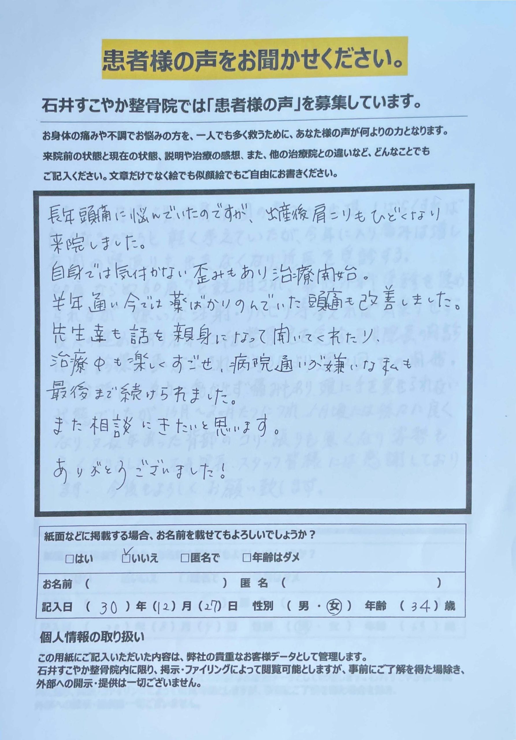 患者様の声 薬をのむほどの頭痛や産後の肩こりも改善しました。 2021.10.12 匿名希望さん(30代・女性) 長年頭痛に悩んでいたのですが、出産後肩こりもひどくなり来院しました。 自身では気付かない歪みもあり治療開始。 半年通い今では薬ばかりのんでいた頭痛も改善しました。 先生達も話を親身になって聞いてくれたり、治療中も楽しくすごせ、病院通いが嫌いな私も最後まで続けられました。 また相談にきたいと思います。 ありがとうございました! Tweet Share Hatena Pocket RSS feedly Pin it この記事のタイトルとURLをコピーする 左肩周囲の痛みだけでなく、長年の悩みも解消されました。 前の記事 交通事故後の首・肩の痛みや頭痛もどんどん楽になっていきました。 次の記事